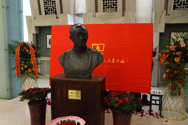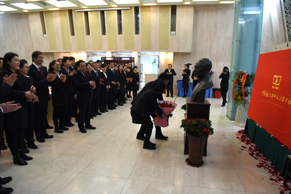 國際公司全體員工為總館120歲生日準(zhǔn)備了美麗的花束,并將其敬獻(xiàn)至商務(wù)印書館先驅(qū)張?jiān)獫?jì)先生,并向張老三鞠躬以表敬意。