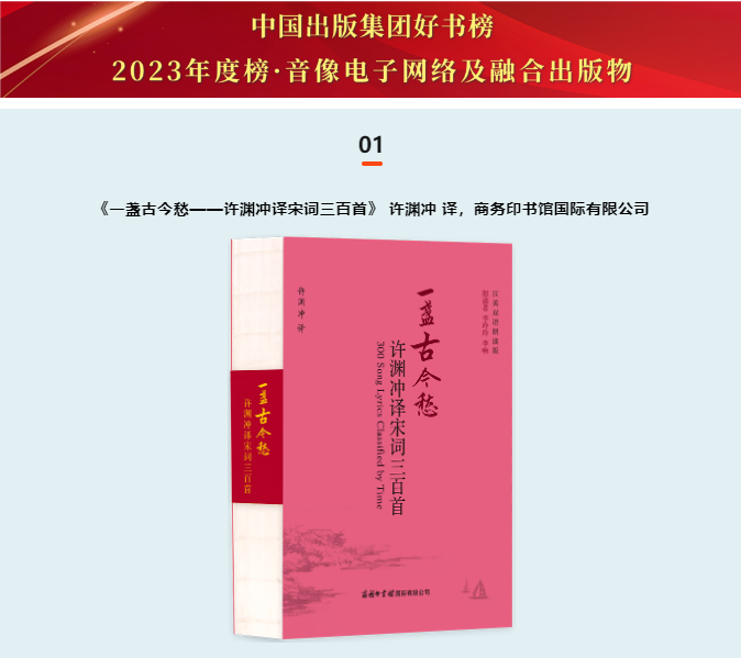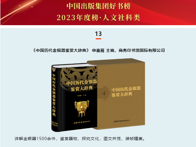 近日,在中國出版集團有限公司公布的“中國出版集團好書榜”2023年度榜上,商務印書館國際有限公司(簡稱“商務國際”)出版的《中國歷代金銀器鑒賞大辭典》和《一盞古今愁——許淵沖譯宋詞三百首》分別入選人文社科類和音像電子網絡及融合出版物好書榜。